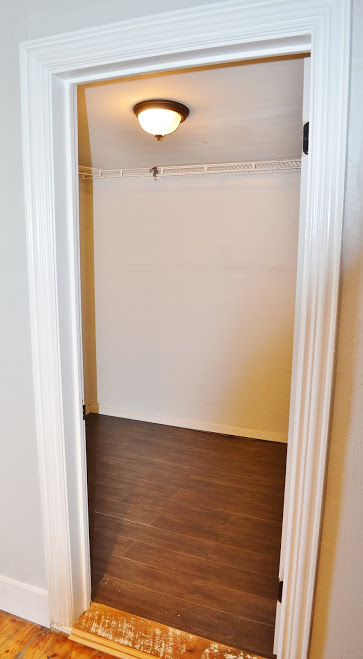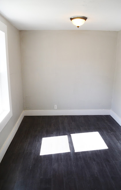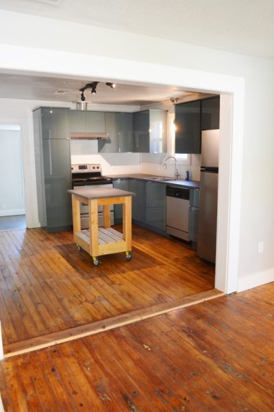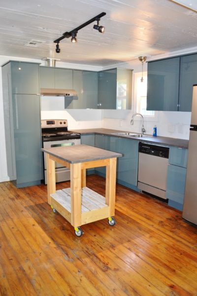 And, voila! We gave everything a coat of glossy white. $400 (for all) Craigslist appliances grace the kitchen (in nearly perfect condition). We added a vent-a-hood that vents to the outside, new lighting, concrete-look countertops, and supersweet pantry drawers. [I love my kitchen, but I’m actually jealous of the pantry drawers in the rental house..] We built an island on casters with the extra length of leftover countertop from IKEA and a few pieces of lumber.
